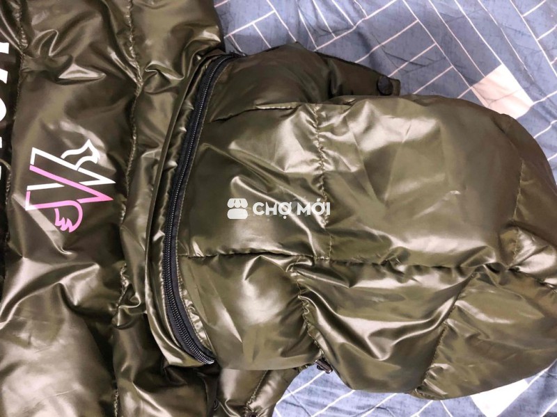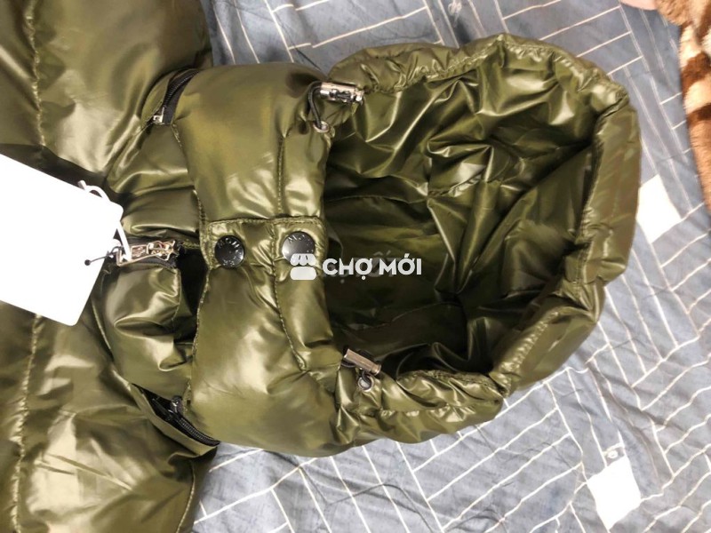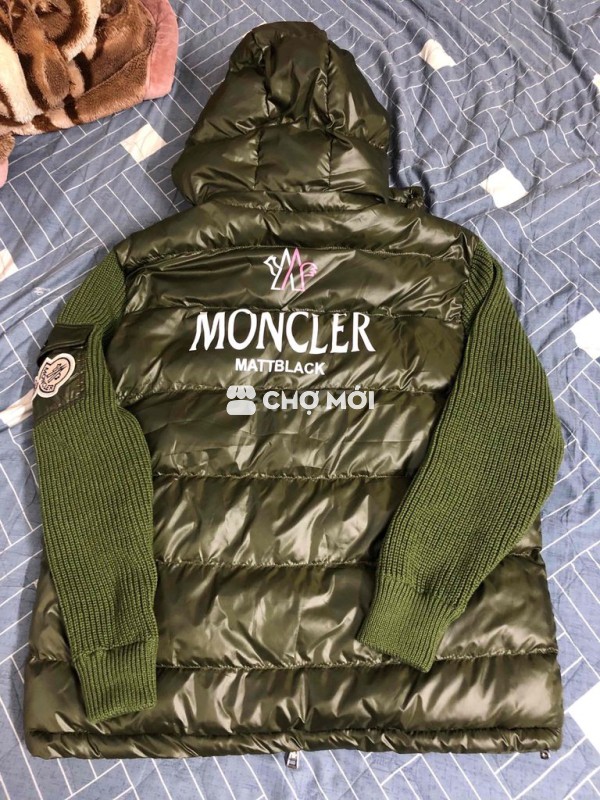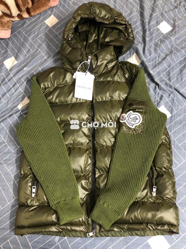 Áo khoác phao Moncler màu xanh rêu, chất liệu phao và len giữ ấm tốt.