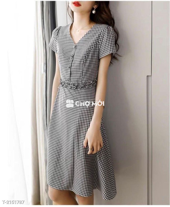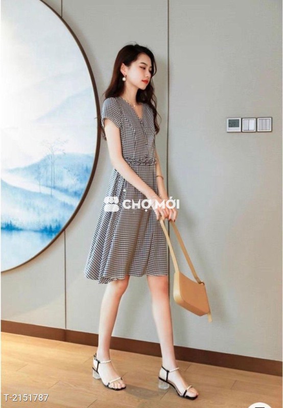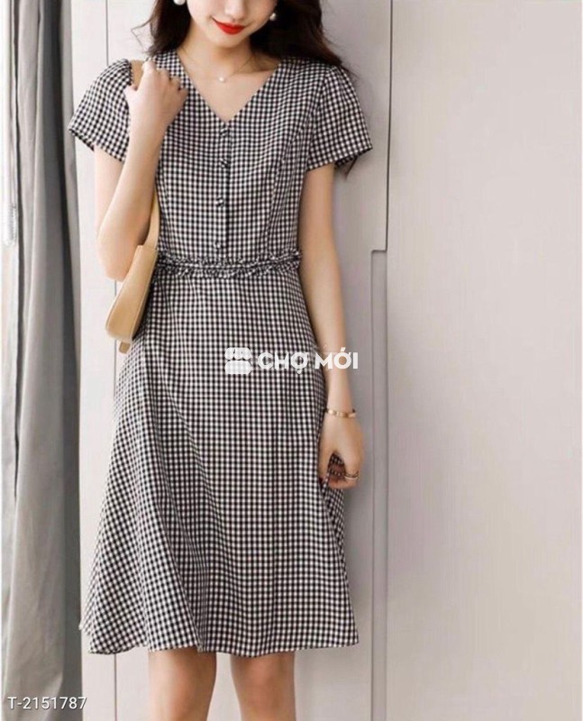 Kiểu dáng : đầm dáng xòe nhẹ, cổ v, tay ngắn, đính nút bọc, eo phối bèo cách điệu, dây kéo sau lưng