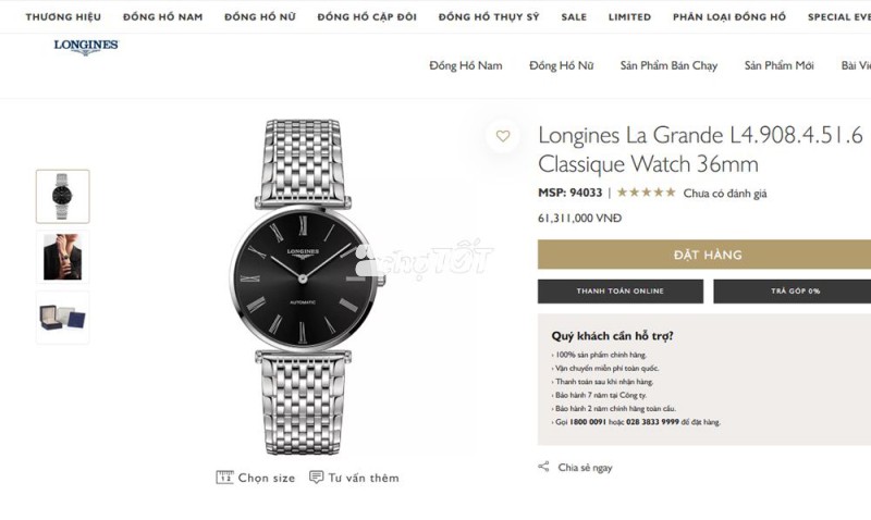 - Máy : Automatic ( Máy cơ tự động ) sử dụng bộ máy Caliber L591 thời gian lưu cót đến 45 giờ...