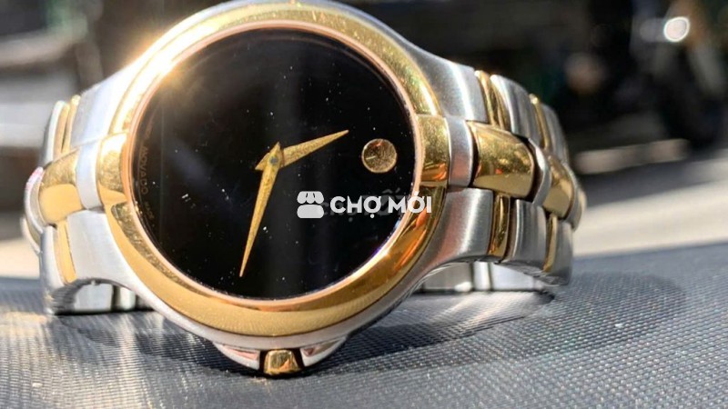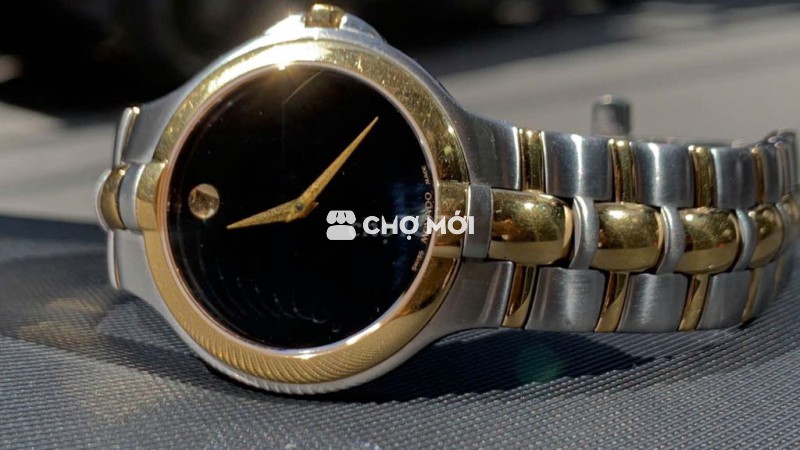 movado 5381451 máy pin niềng + núm + kim + logo mặt trăng bằng vàng , thân máy là inox sước, dây khóa inox demi vàng rất nổi bật