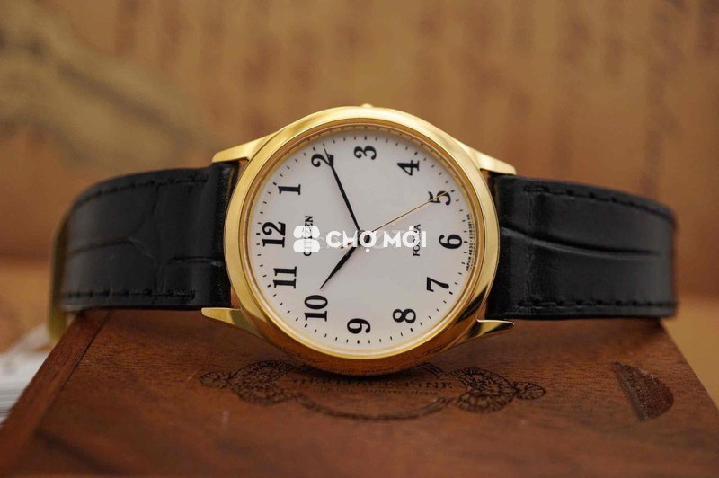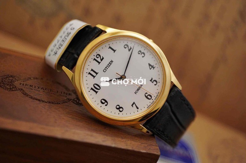 Citizen Forma với size 34mm – lựa chọn chuẩn cho cổ tay nhỏ 14–16cm hoặc ai yêu thích phong cách dress watch truyền thống. Mặt trắng thanh khiết, số Ả Rập cổ điển, kim mảnh; vỏ mạ vàng nhã nhặn, dễ phối vest – sơ mi.