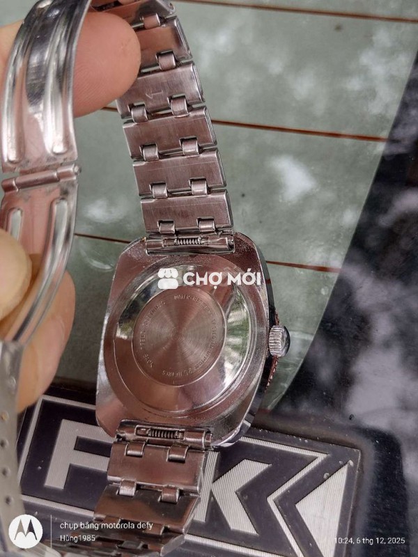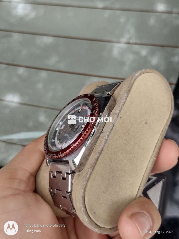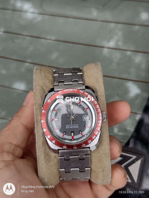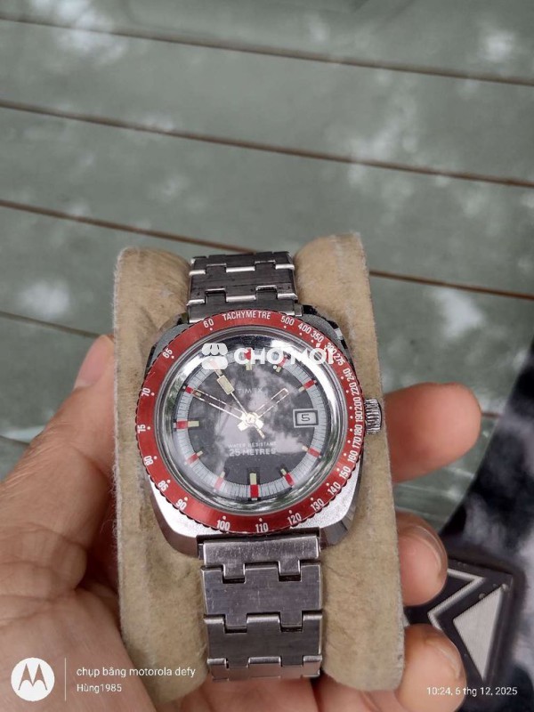 Timex Water Resistant 25 Metres. Size: 36mm Máy cót tay đẹp chạy chuẩn các chức năng. Vỏ mạ crom niềng xoay đẹp kim cọc mặt zin khá đẹp dạ quang sáng, dây thép lk Giá: 700k. Cod cọc 200k ck hết bao ship nhanh Lh: alo,zalo,chotot