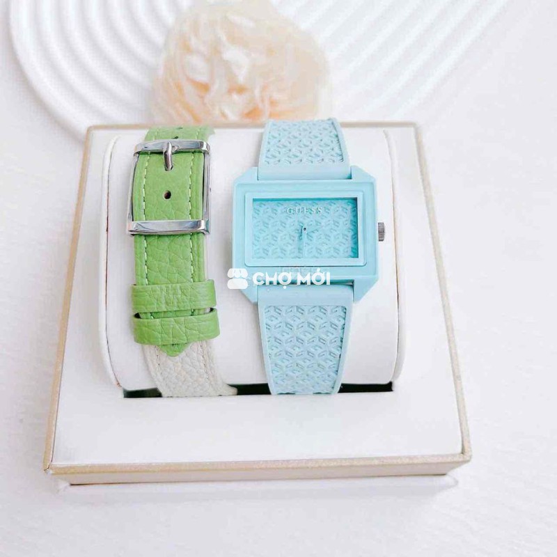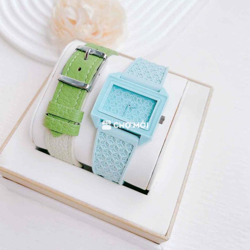 🌟🌟 Set Guess New collection 2026 ra mắt với thiết kế mặt vuông dây silicon + dây da xanh rêu cực kỳ bắt mắt. 💕Case vuông ~ 33mm 💕Dây silicon xanh lên tay xinh lắm 💕Máy pin Nhật, chống nước 30M Máy bảo hành 2 năm