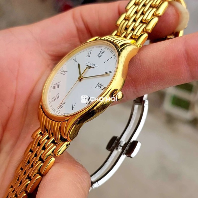 - Mặt đồng hồ tròn, kim và cọc số vàng nổi bật.