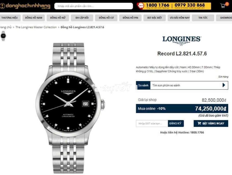 Đồng Hồ Nam : Longines Record Chronometer Automatic L2.821.4.57.6 Diamond - Size 40mm, Fullbox...