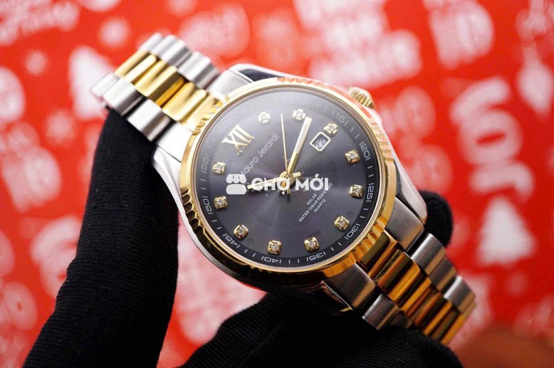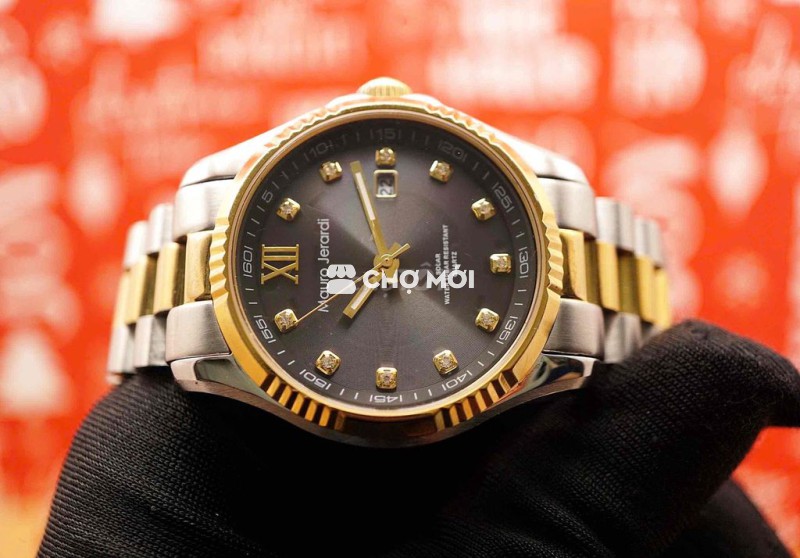 Mauro Jerardi mang tinh thần thiết kế Ý: gọn gàng, lịch lãm và dễ đeo. Phiên bản two-tone thép – vàng với mặt số xám tia sunburst tạo cảm giác sang trọng vừa đủ, không phô trương. Cọc số đính đá kết hợp số La Mã XII tạo điểm nhấn cổ điển, phù hợp môi trường công sở và các dịp trang trọng.