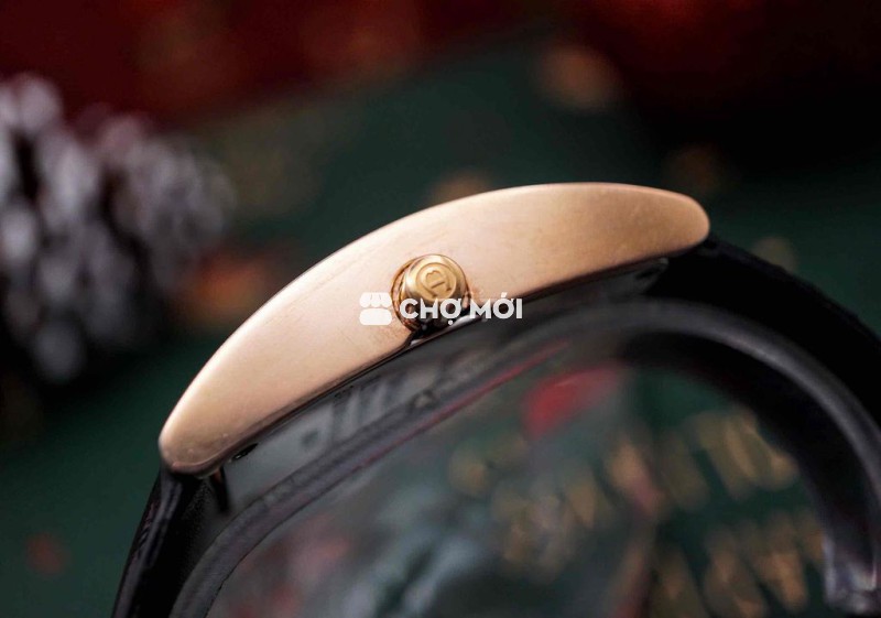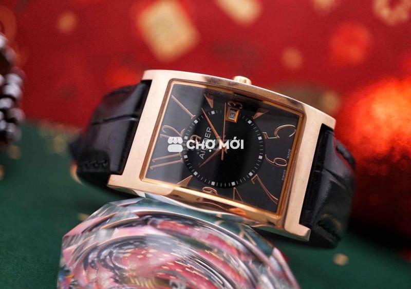 dáng vỏ chữ nhật cong nhẹ theo cổ tay, viền mạ vàng hồng ấm áp, mặt đen sâu kết hợp cọc số Art-Deco mềm mại – lịch lãm nhưng không cứng nhắc.