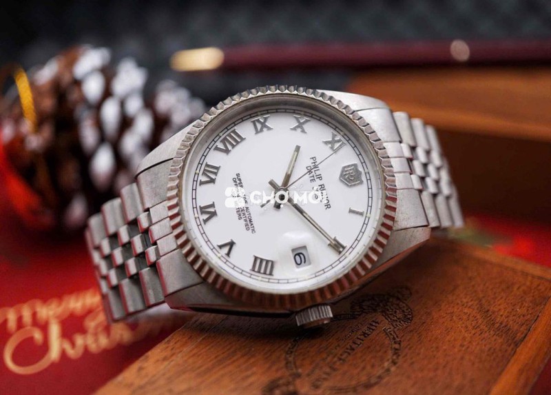 mặt trắng trang nhã, cọc số La Mã nổi, bezel khía cổ điển và ô lịch phóng đại – những chi tiết đã trở thành biểu tượng của đồng hồ lịch lãm.