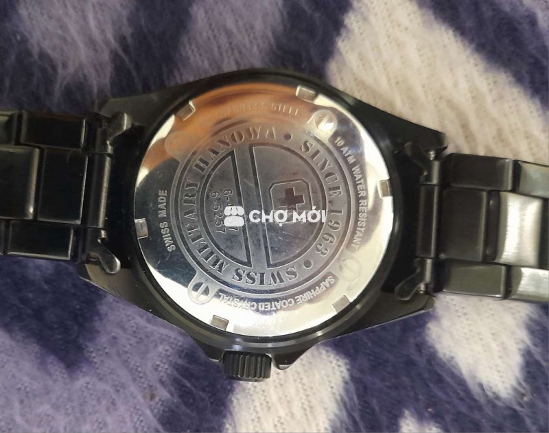 Đồng hồ nam Swiss Military Hanova, Thụy Sĩ. Máy quartz chạy chính xác, size 42 cả núm, chất liệu thép không gỉ màu đen, kính lồi phủ sapphire, mặt cọc kim màu đen huyền bí, niềng xoay nhẹ nhàng, độ chống nước 10atm. Hình thức còn khá đẹp, đeo đầm tay.