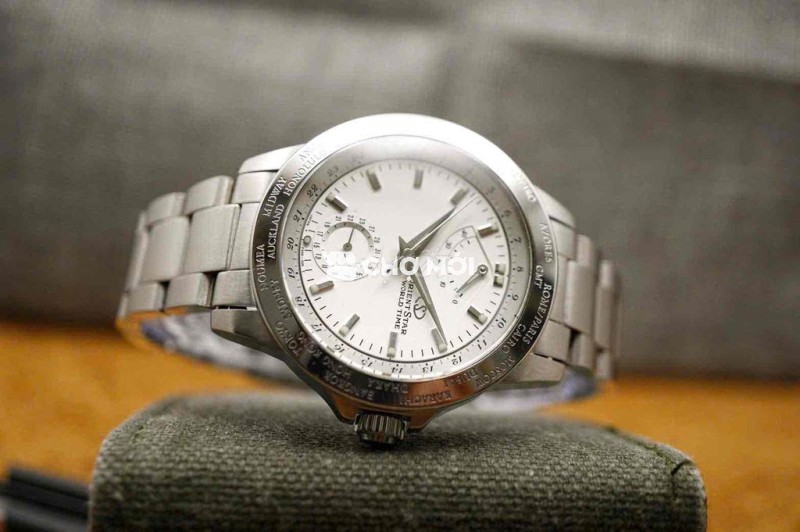 Thiết kế mặt trắng thanh lịch, cọc số nổi sắc nét. Vòng bezel khắc tên các thành phố lớn trên thế giới – đúng chất World Time, vừa thực dụng vừa tạo chiều sâu thị giác. Bố cục mặt cân đối với kim GMT trung tâm và hai mặt phụ hiển thị thời gian phụ/24h, nhìn kỹ mới thấy hết độ tinh tế.