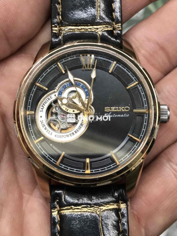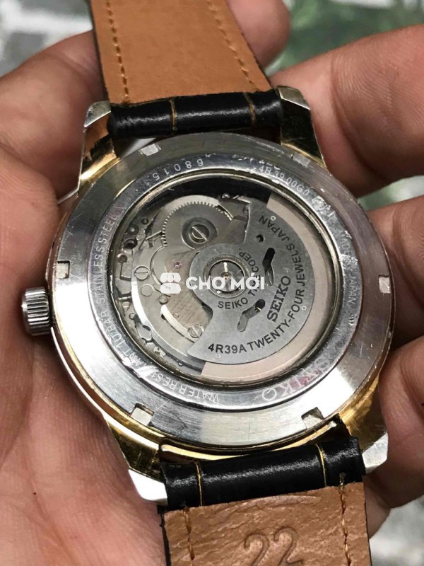 Đồng hồ tự động Seiko V size 42 mm, vỏ mạ vàng, niềng khía, lộ cơ 2 mặt, chạy rất êm, có cót phụ. Bộ dây da bò thay mới, khoá bướm mạ vàng. Máy cơ Seiko Time 4R39A cao cấp. Giá 1tr7. Ck đủ bao ship.
