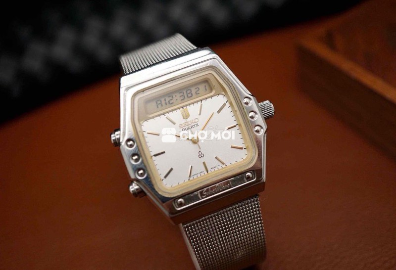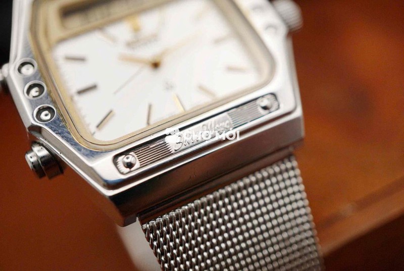 Vỏ vuông bo góc phong cách kỹ thuật Nhật thập niên 70, ốc lộ thiên – nhiều nút chức năng, đúng chất toolwatch. Mặt trắng ngà patina nhẹ theo thời gian, kim và cọc mạ champagne tạo chiều sâu cổ điển, bố cục gọn gàng dù có thêm cửa sổ digital.
