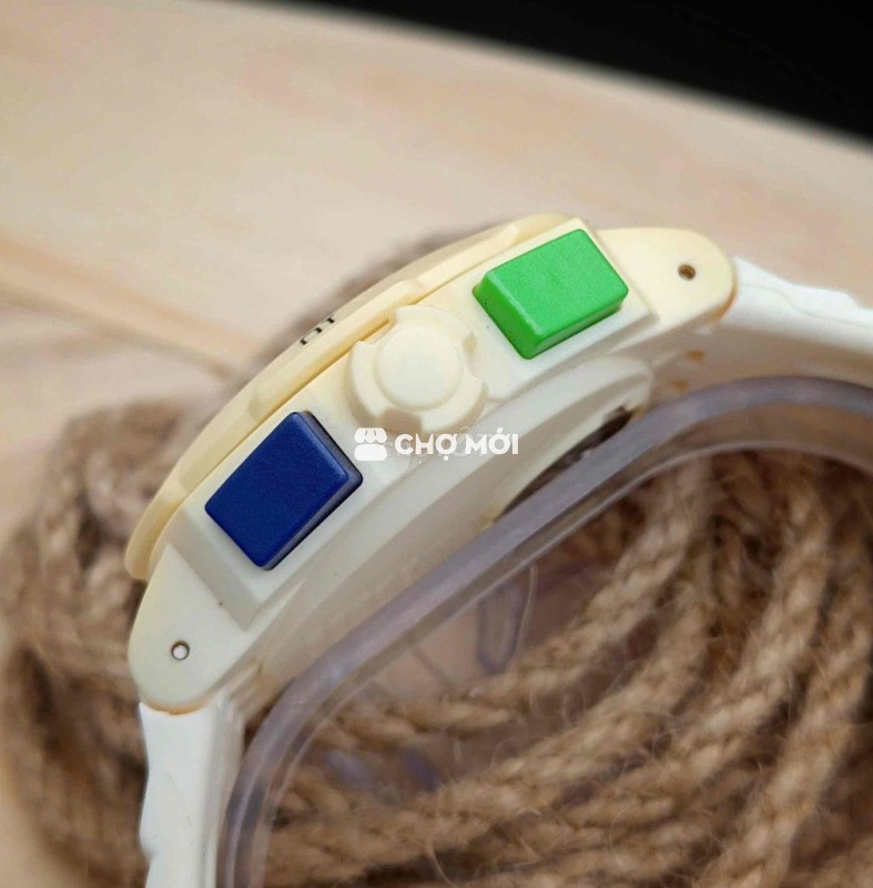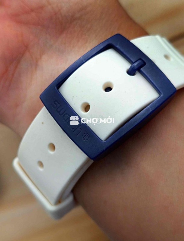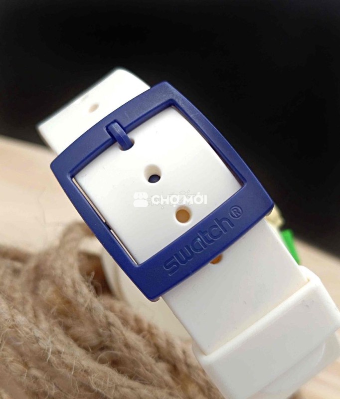 Điểm thú vị nằm ở chi tiết: nút bấm đa màu, kim dạ quang trắng, dây silicone trắng kết hợp khóa xanh navy – tất cả tạo nên một tổng thể rất “Swatch”, khó nhầm lẫn với bất kỳ hãng nào khác.