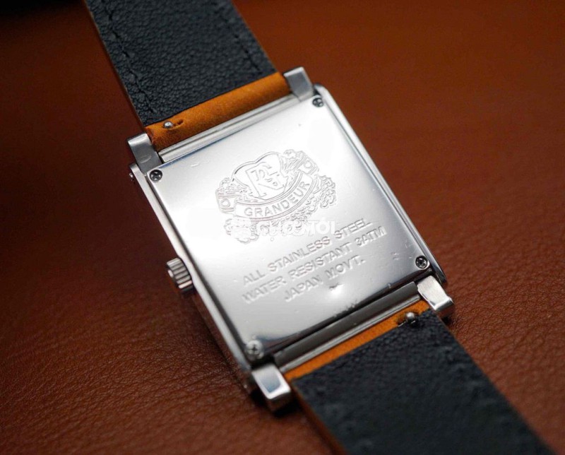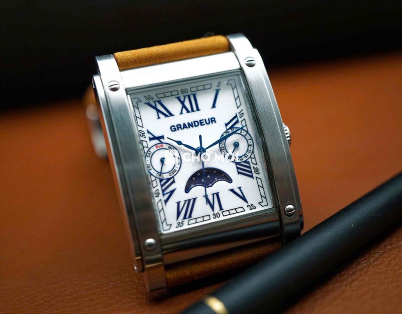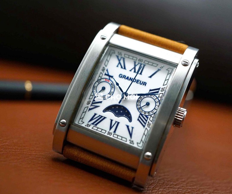 Một thiết kế “tank” rất thanh lịch của GRANDEUR: mặt trắng – số La Mã xanh – kim nung xanh, kết hợp lịch thứ & moonphase tạo chiều sâu thị giác. Đeo lên tay là cảm giác chỉn chu, lịch lãm đúng kiểu dress watch Nhật.