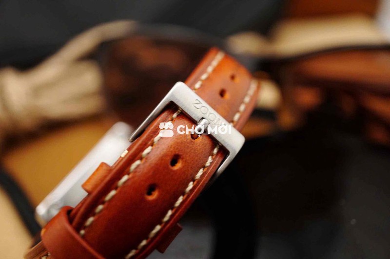 Điểm đặc biệt nằm ở dây da nâu thủ công: da thật dày dặn, nhuộm màu thủ công, đường chỉ khâu nổi kiểu saddle-stitch cổ điển. Dây càng đeo càng lên nước, tạo patina tự nhiên – đúng tinh thần đồng hồ cổ thanh lịch.