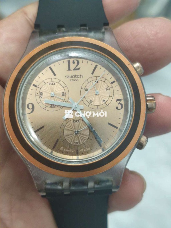 Đồng hồ nội địa Thụy 3 cốt 6 kim, size 43mm không kể núm, vỏ nhựa & nhôm, dây silicon, máy Thụy V8 4Jewels. Giá 370K