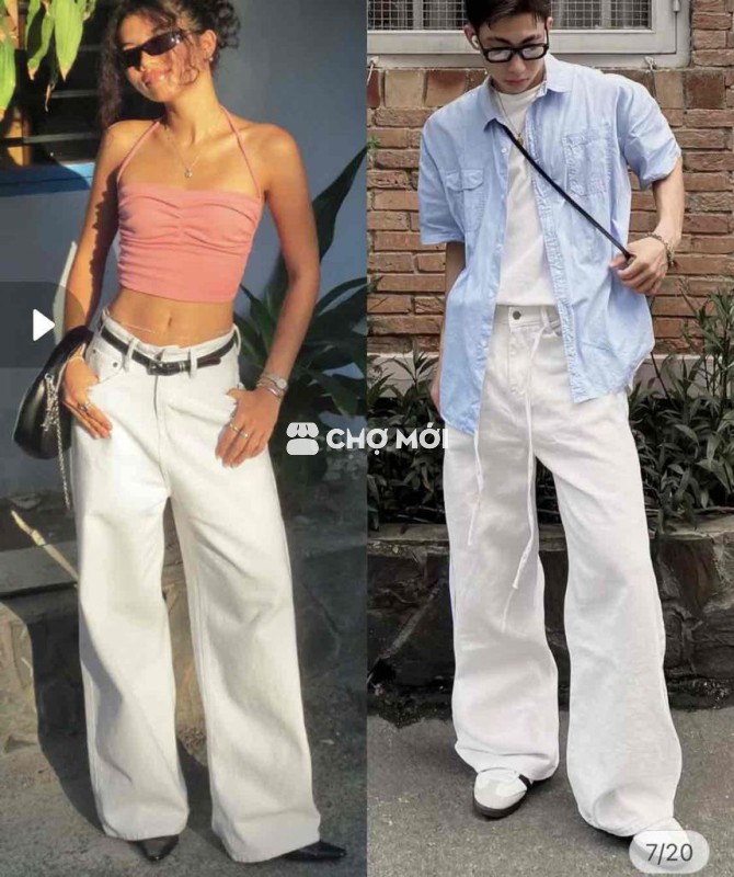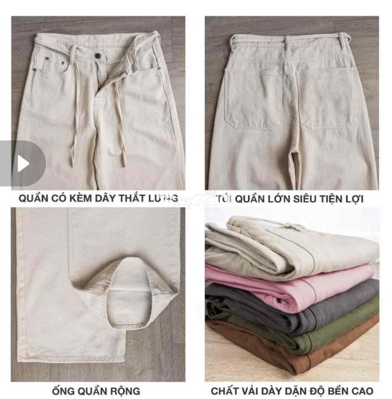 Quần jean ống rộng màu be, chất liệu vải dày dặn, phù hợp cho cả nam và nữ.