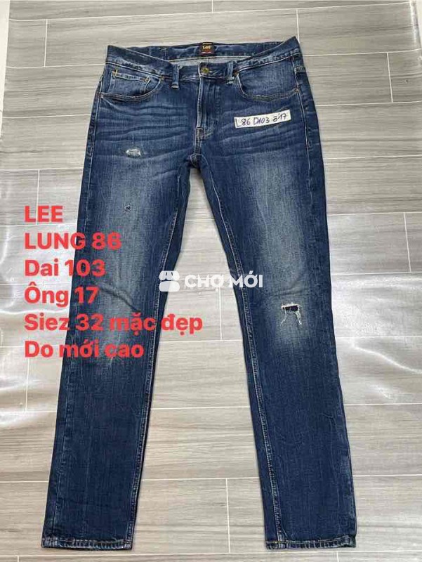 Quần jean nam Lee màu xanh, size 32, kiểu dáng trẻ trung, dễ phối đồ. - Vòng eo 86 cm, dài 103 cm, ống quần 17 cm. - Chất liệu jean bền đẹp, thoải mái khi mặc. - Phù hợp đi chơi, đi làm.