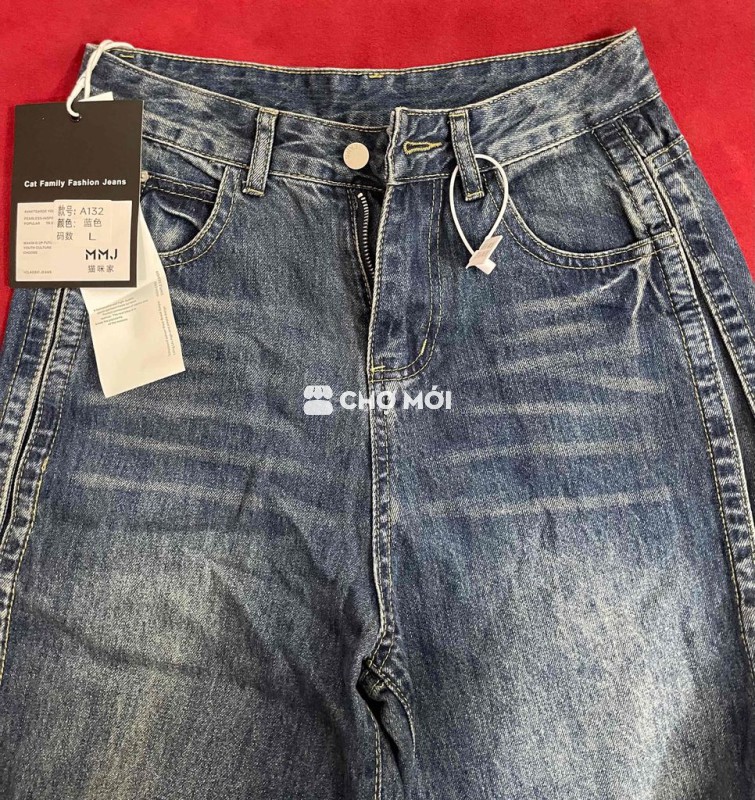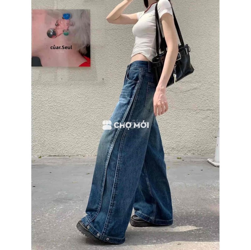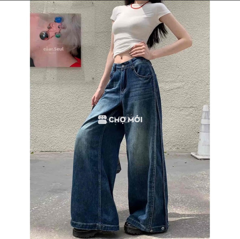 [Newtag] Quần Jean Nữ QC Cao Cấp Eo Cao Tôn Dáng | Ống Rộng Dài 107cm Phối 2 Bên Thời Trang Sang Trọng | Size L 53–62kg Eo 72–74cm