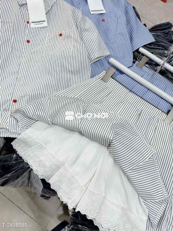 SET sơ mi sọc 2 túi nút đỏ kèm chân váy xếp ly ,có lót quần phối ren freesize dưới 55kg như hình 1 màu trắng