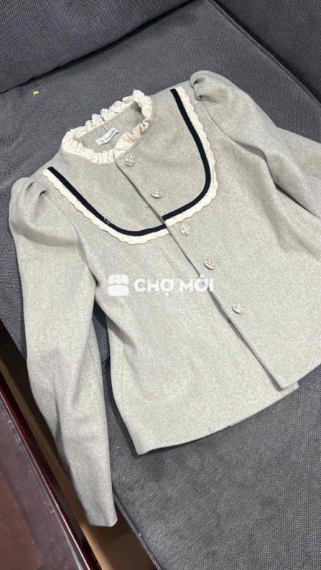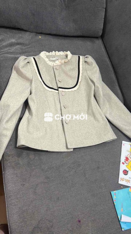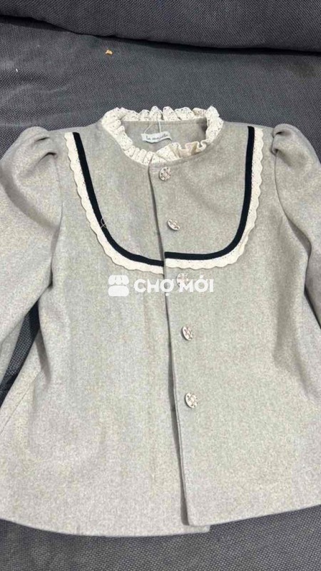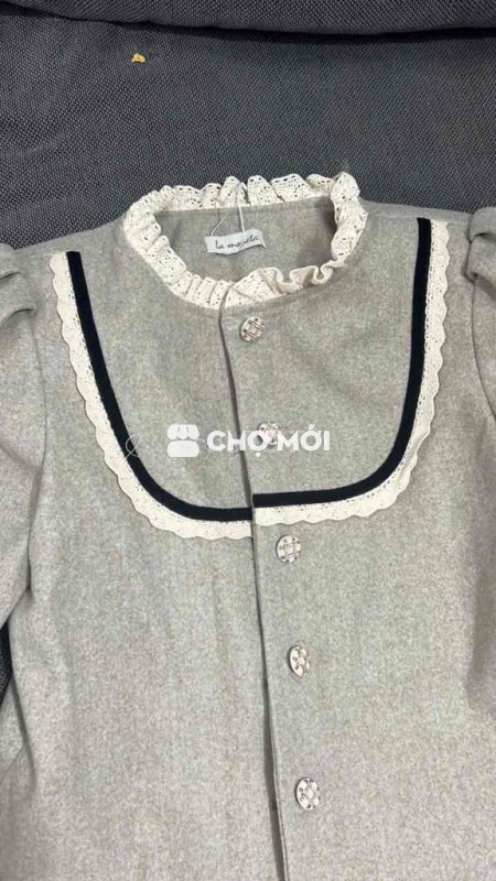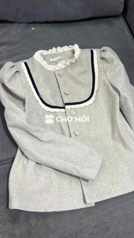 Áo khoác nữ màu xám, chất liệu vải mềm mại, kiểu dáng cổ bèo điệu đà.