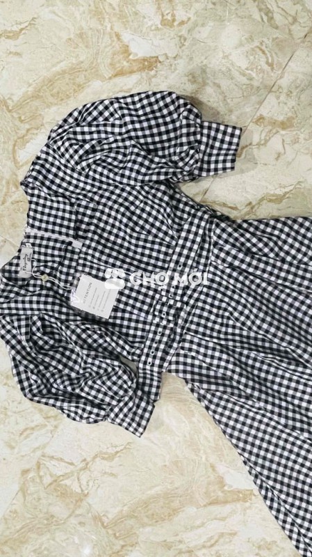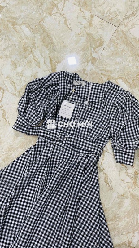 Váy nữ kẻ caro tay phồng Đen trắng Mới