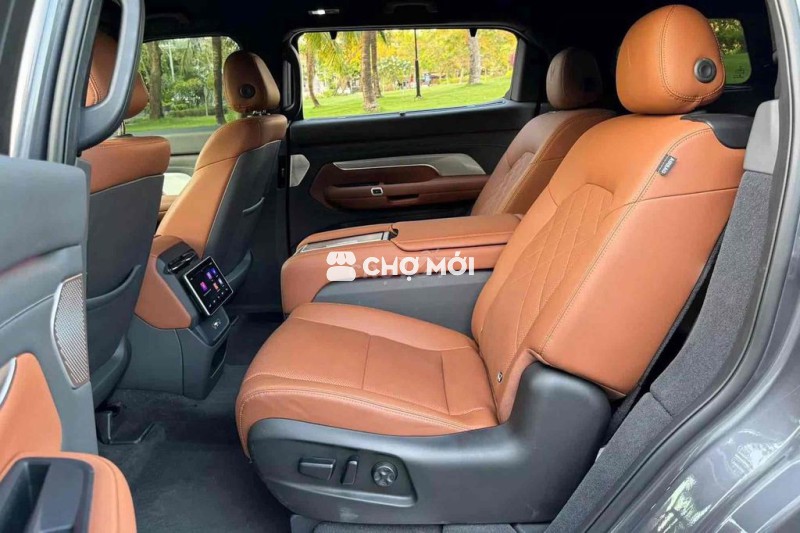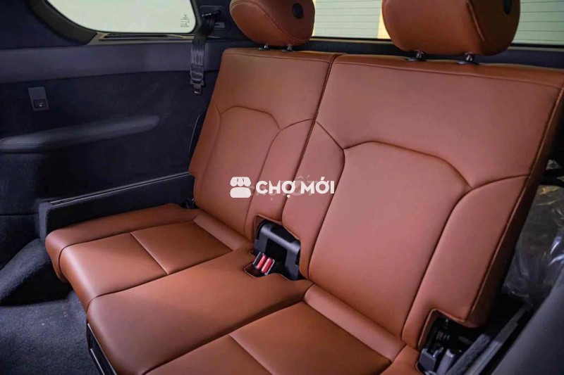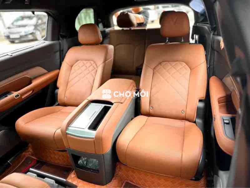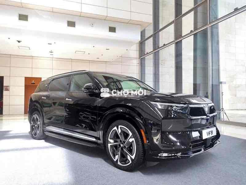 VinFast VF9 màu đen, dòng SUV điện 7 chỗ, nội thất nâu da bò sang trọng.