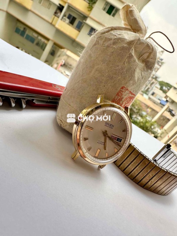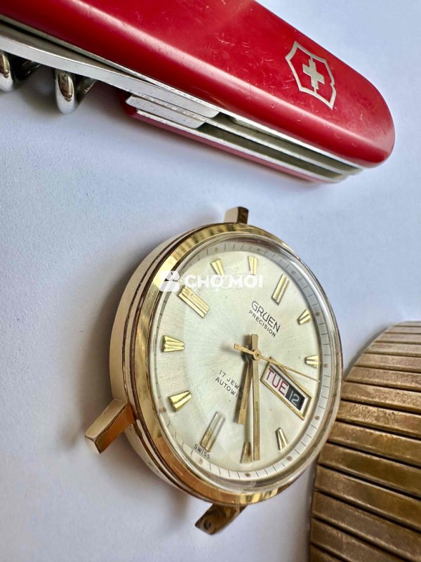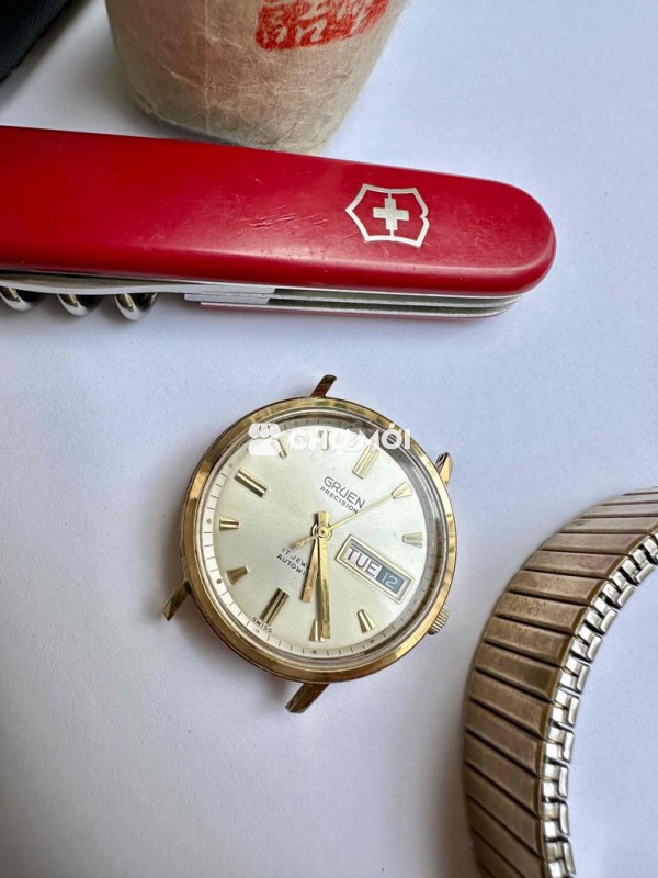 Vintage Gruen Automatic 17jw Cơ automatic, 2 lịch date Dater hoạt động chuẩn xác Bọc vàng đẹp, Mặt mâm trắng Chải tia Size Dây 18mm, Thương hiệu tiền thân Rolex Size 35mm
