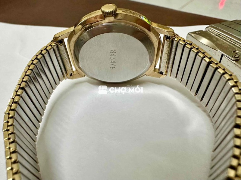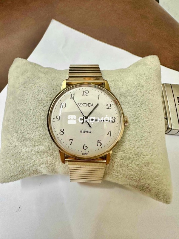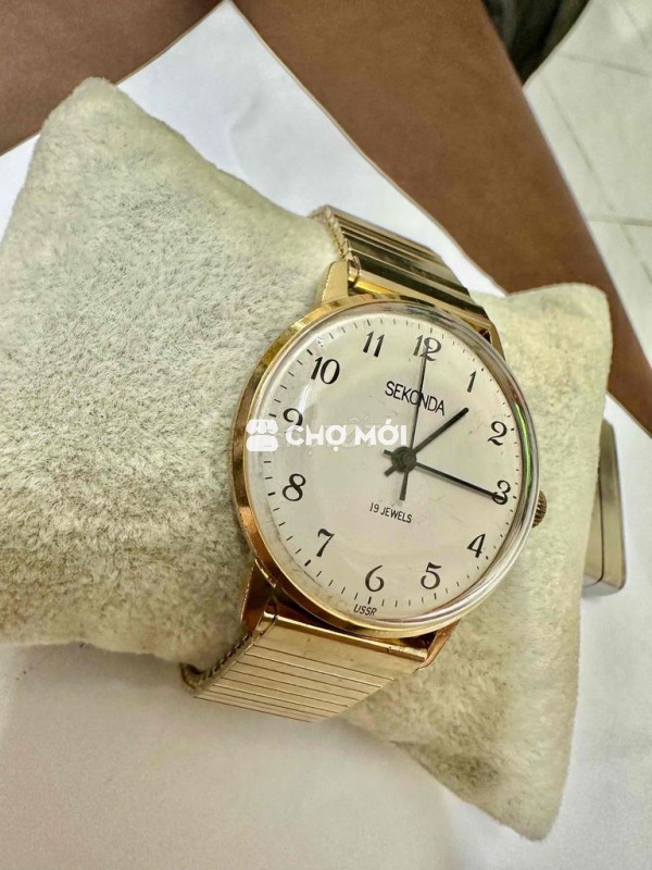 Vintage Sekonda 34mm AU 10 Cơ Cót tay Dây chun bọc vàng thụt thò 18mm Mặt men, số học trò Vàng Bọc đẹp Thương hiệu Liên Xô xuất sang Anh Quốc
