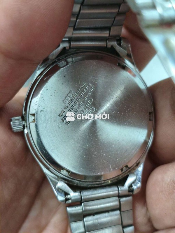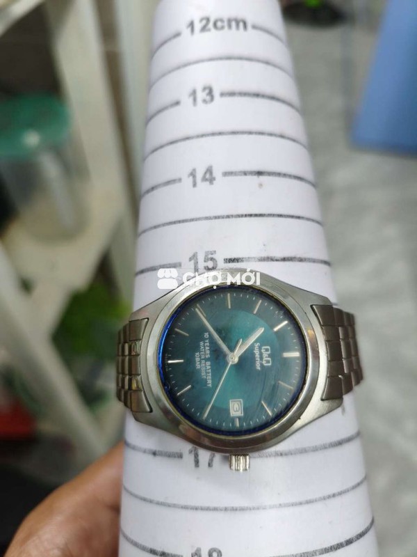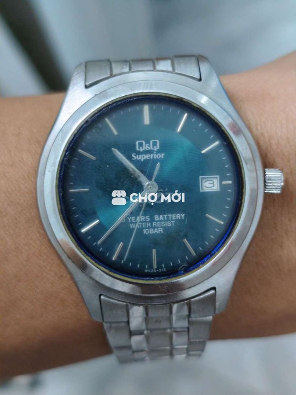 Xác đồng hồ Nhật, size 36mm không kể núm, mặt xanh, 1 lịch, kính khá chầy, lịch vặn 24 giờ mới sang ngày, đáy xoáy chống nước. Giá 130K