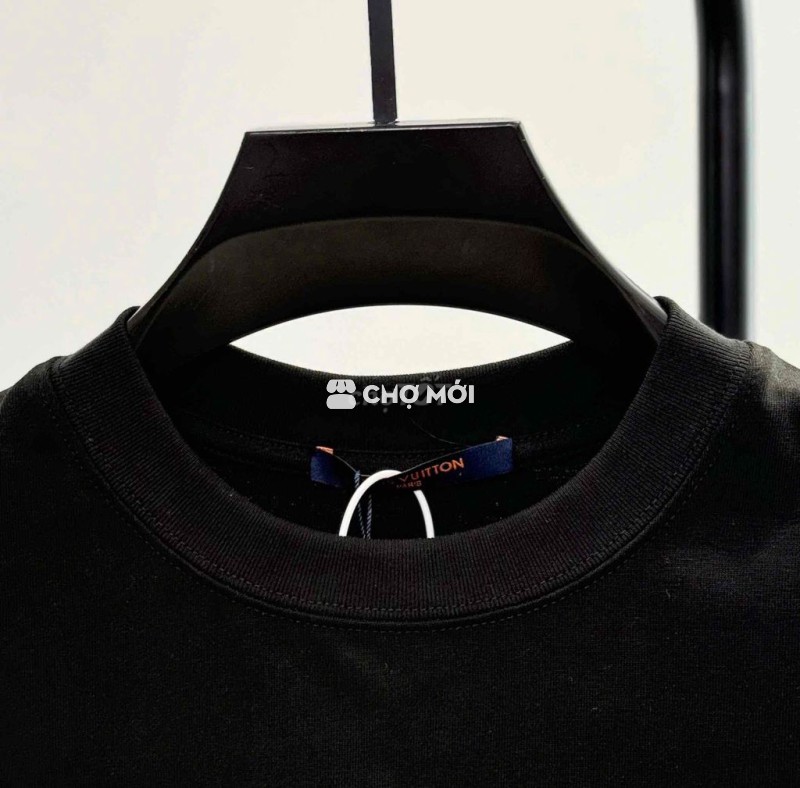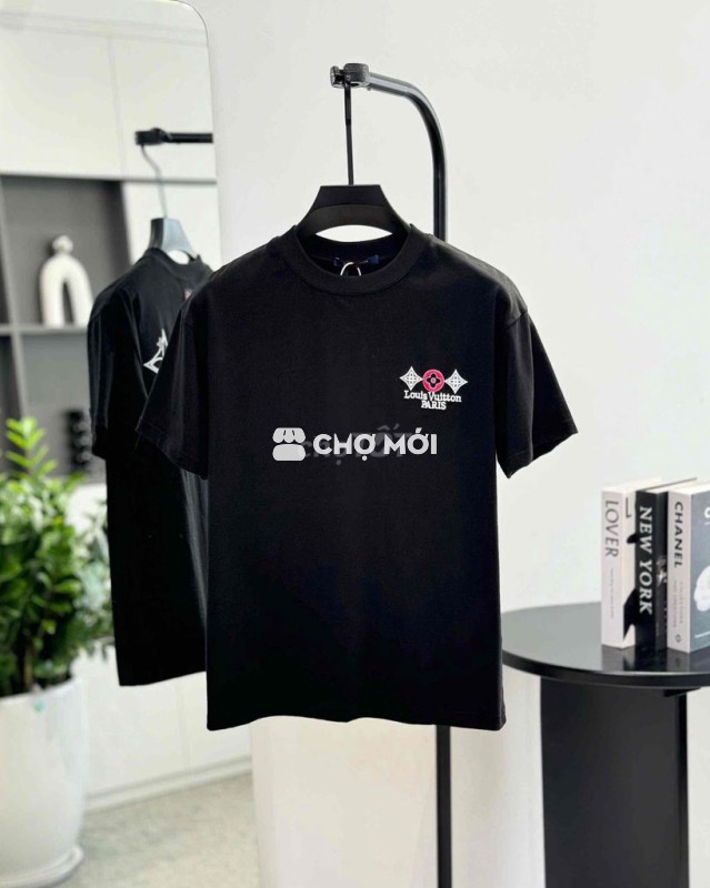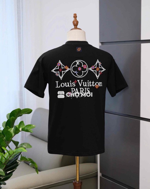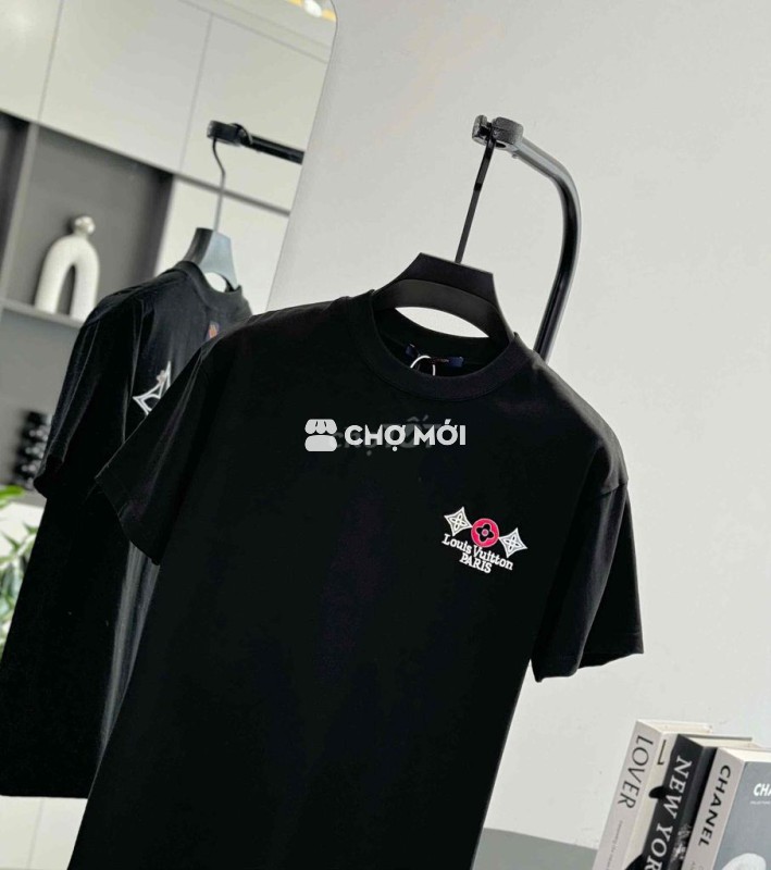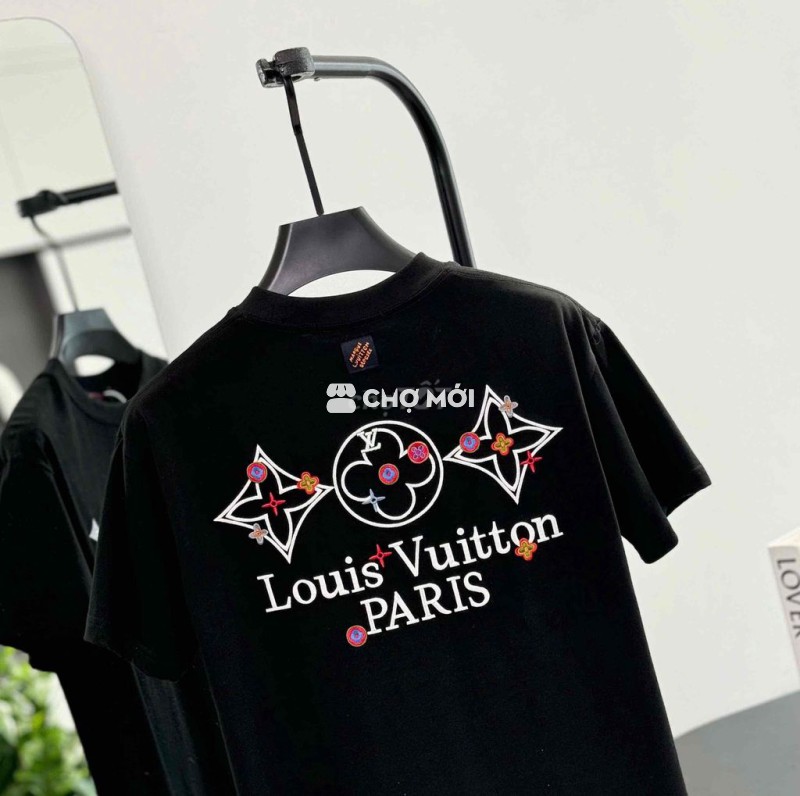 Áo phông LV màu đen, họa tiết hoa ngực trắng đỏ nổi bật.