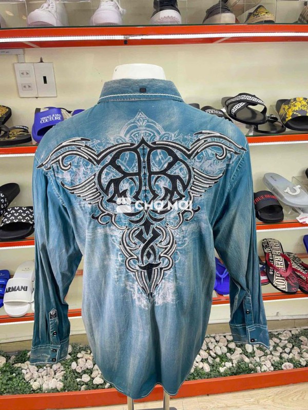 Áo sơ mi nam chất liệu jean màu xanh, thiết kế thêu cá tính.
