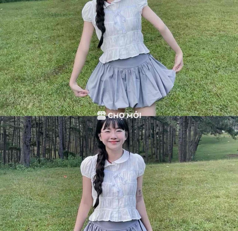 Áo sơ mi nữ trắng nhún tầng cổ sen, có dây ren thắt nơ Peko. - Áo mới, còn nguyên tag. - Thiết kế trẻ trung, nữ tính. - Size S - v1 90cm - Giá 130.000.