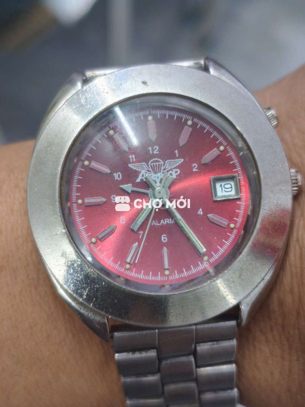 Đồng hồ nội địa Nhật, size 37.5mm không kể núm, 1 lịch, mặt đỏ đô, pin Zin chạy từ Nhật về VN, có kim báo thức không biết sử dụng. Giá 250K