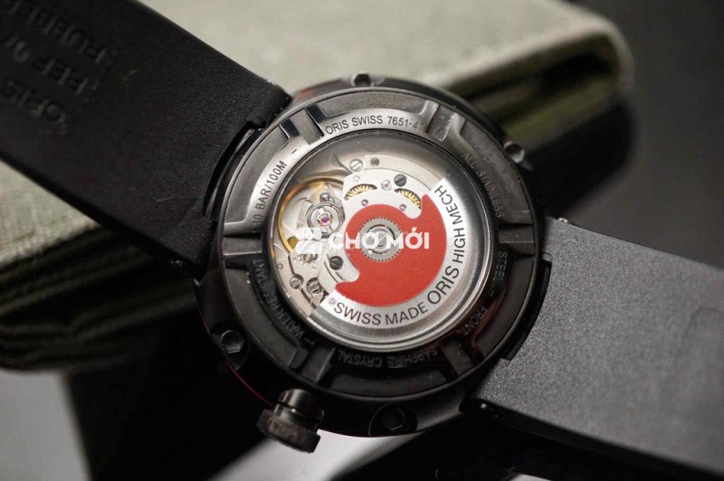 Đáy lộ máy với rotor đỏ đặc trưng Oris High-Mech – chi tiết nhận diện quen thuộc của Oris automatic.
