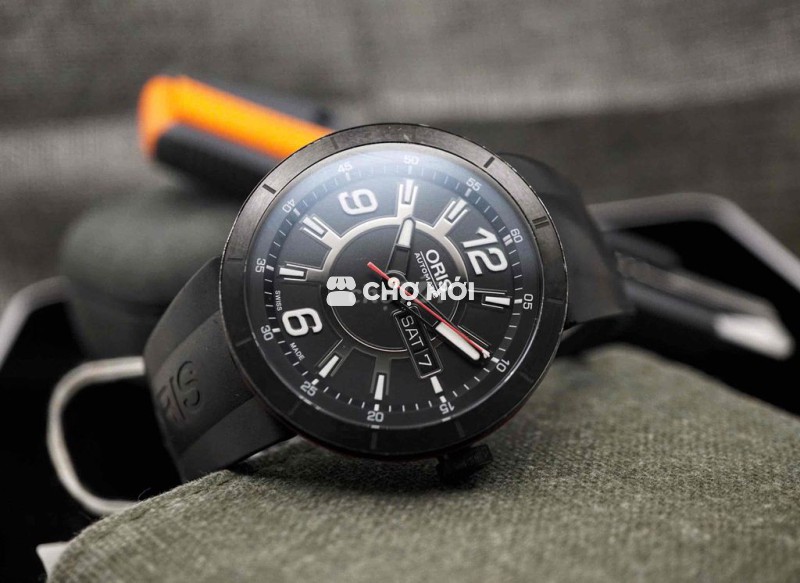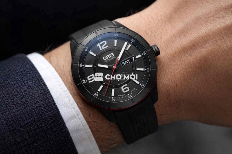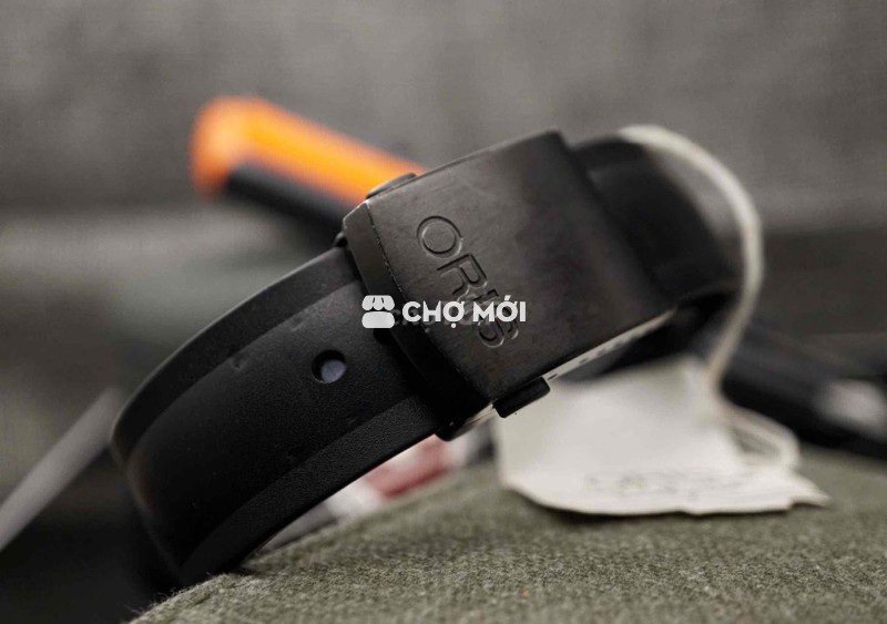 Vỏ thép phủ đen mờ, dây cao su Oris nguyên bản ôm tay – cảm giác đeo chắc, thể thao nhưng vẫn lịch sự.