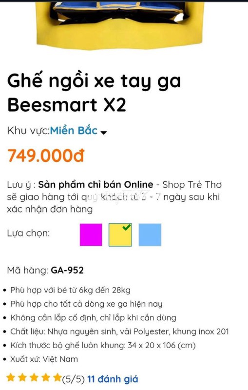 Ghế ngồi xe máy Beesmart X2 màu vàng, xanh dương, chất liệu nhựa nguyên sinh và polyester. - Sản phẩm chính hãng, chưa sử dụng luôn. Nay để lại cho bác nào nhà có con nhỏ. - Ghế thiết kế an toàn, thoải mái cho bé. - Xuất xứ Việt Nam.