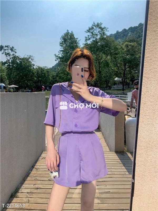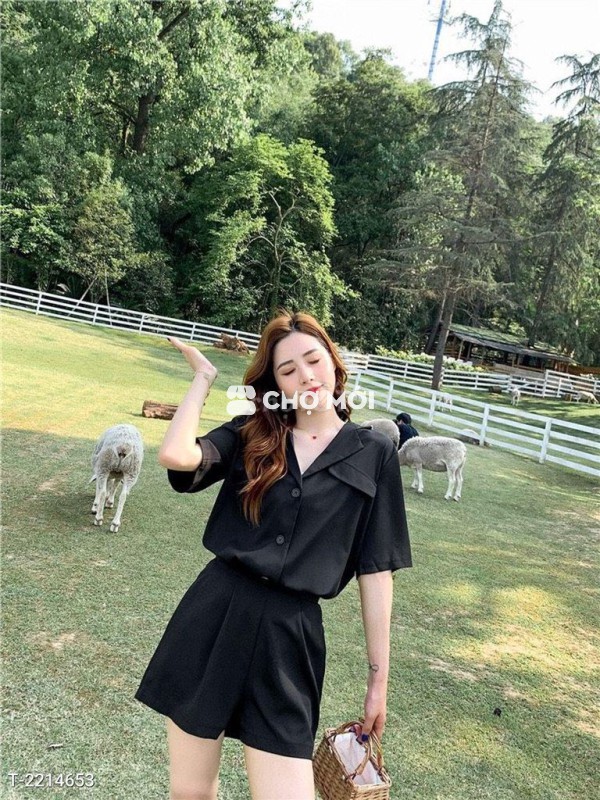 Kiểu dáng: áo cổ vest, tay ngắn, cài nút trước, quần ngắn xếp li , 2 túi, lưng sau thun
