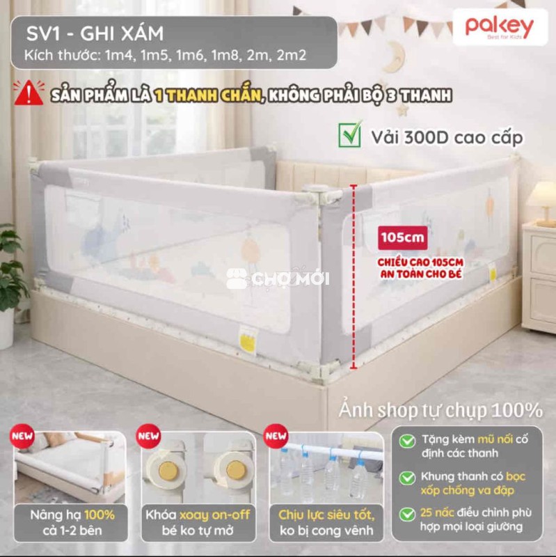 Thanh chắn giường Pakey màu ghi xám, chất liệu vải 300D bền chắc. - Chiều cao 105cm, nâng hạ 100% tiện lợi. - Pass thanh 2m2. - Giúp bé ngủ an toàn, ba mẹ yên tâm.