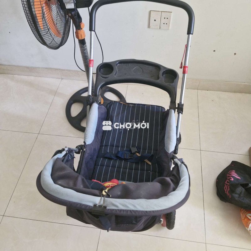 Xe đẩy em bé màu xanh đậm, khung kim loại chắc chắn, vải bền đẹp.